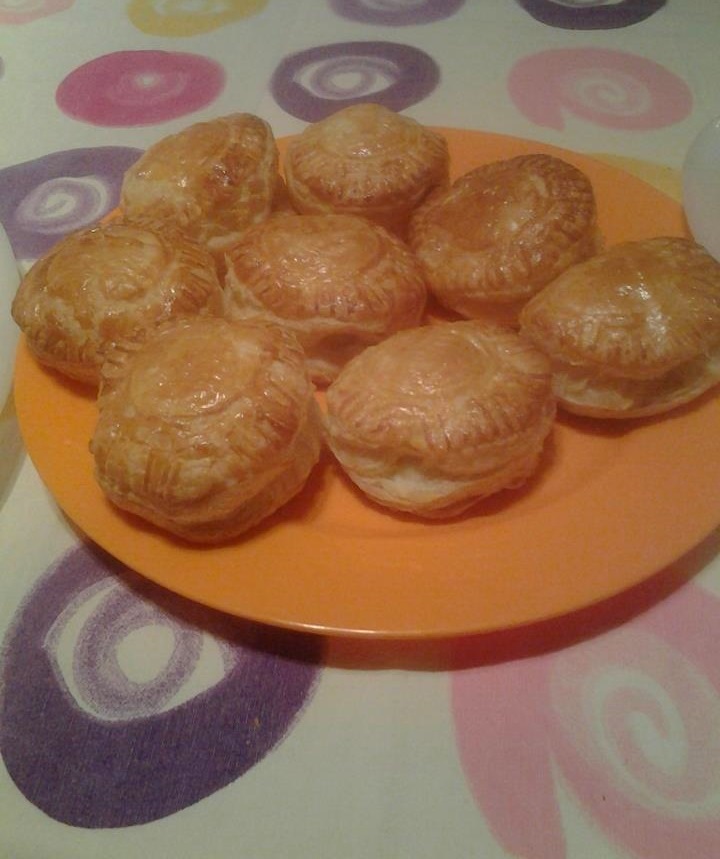 Cortar 18 discos redondos de la masa hojaldre. Rellenar la base del disco con 1 cuchara de besciamella, una cuchara de mozzarella y una cuchara de salsa de tomate. Mojar el borde del disco con un poco de huevo y cubrir con un disco. Cerrar bien y con un pincel mojar la superficie con huevo y cocinar en el horno precalentado a 200°C durante 10 minutos. Servir templado!
