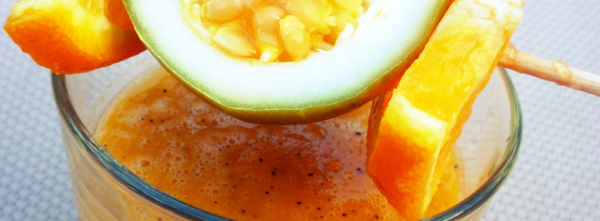 Lavamos y troceamos las manzanas, la manga, y el plátano. Cortamos el fruto de la pasión a mitad y con la ayuda de una cuchara extraemos la pulpa. Exprimimos las naranjas para obtener el zumo. En el vaso de la batidora echamos la fruta, el zumo y un poco de hielo y batimos todo hasta conseguir una consistencia cremosa. Servimos en un vaso bien frío y decoramos con fruta fresca. Si queremos podemos añadir un poco de azúcar antes de batir, por si la maracuyá está demasiado ácida.