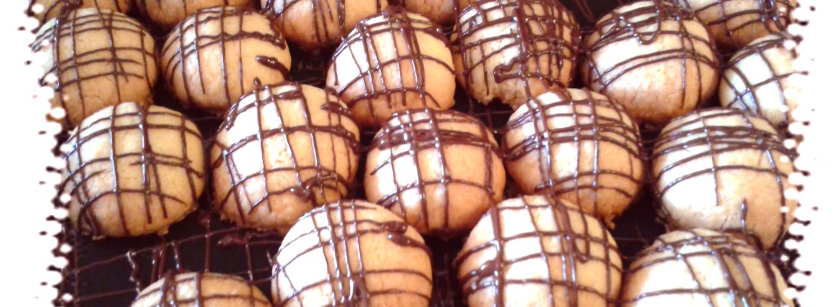 En un bol verter todos los ingredientes y amasar con las manos hasta obtener una masa lisa y uniforme (masa quebrada). Formar bolas de 10g/15g, colocar en una bandeja de horno revestida con papel de horno. Dejar suficientemente espacio entre las bolas porque durante la cocción crecen las galletas. Cocinar en horno precalentado y ventilado a 180°C grados durante 15 minutos. Dejare enfriar en la bandeja. Fundir el chocolate negro a baño maría o en microondas. Cuando las galletas estén frías decorar con el chocolate fundido. Se pueden conservar en un bote hermético durante 1 semana.