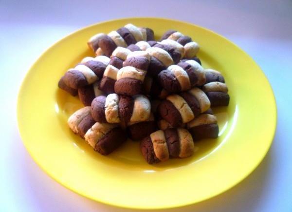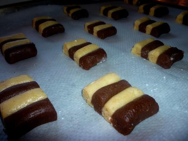 Para la masa de cacao mezclar en un bol todos los ingredientes hasta obtener una masa homogénea y dejar reposar en la nevera durante 1 hora. La misma preparación se hace también para la masa de almendras. Formar las galletas y cocinar en horno precalentado a 150°C durante unos 20 minutos.