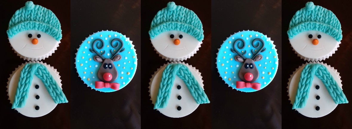 Decoración Cupcake Muñeco de Nieve: Cubrir los cupcakes con una buena cantidad de buttercream y con una espátula alisar la superficie. Extender el fondant blanco y con un vaso o cortador de galletas cortar un circulo para tapar los cupcakes. Para realizar el gorro y la bufanda, hacer salchichas pequeñas de fondant color azul cielo, enrollarlas y ponerlas alternados (enrollado hacia la derecha, enrollado hacia la izquierda) una pegada al otro. Para el gorro cortar una media luna y una bola y poner encima del cupcake. Para la bufanda, utilizar 4 salchichas enrolladas y pegar encima del cupcake. Para los ojos y la barriga realizar 5 pequeñas bolas de fondant negro y decorar el cupcake. Terminar con una nariz de color naranja y diseñar la boca con un cortador de galletas.