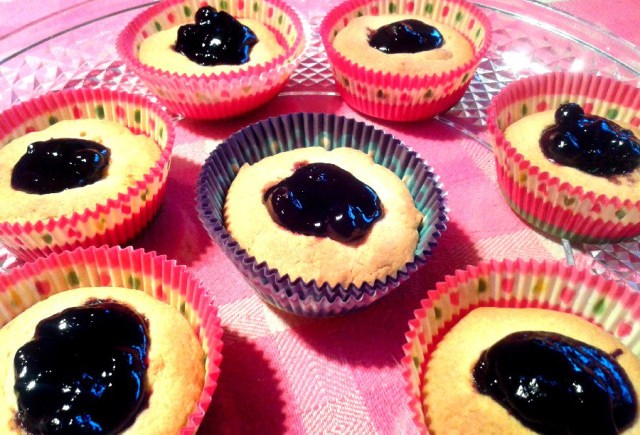 Mezclar la mantequilla templada con el azúcar glas, la vainilla y la ralladura de limón hasta obtener una masa cremosa. Añadir un huevo a la vez, la harina, la levadura en polvo y la maizena. Verter la masa en una manga pastelera y rellenar los moldes de muffins. Presionar en el centro de la galleta con el dedo pulgar para hacer un hueco y luego añadir una cucharada de mermelada de arándanos. Cocinar en el horno ventilado y precalentado a 170°C durante 20 minutos. Decorar con azúcar glas.