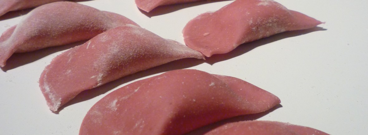 Para la pasta, mezclar la harina con una cuchara de aceite de oliva, un poco de sal y añadir poco a poco el puré de remolacha, hasta obtener una masa homogénea. Dejar reposar durante 1 hora en la nevera. Preparar el relleno. Extender la pasta con la máquina hasta el número 5, rellenar y cerrar bien los ravioles y cortarlos. Cocinarlos en agua caliente salada durante 2/3 minutos.