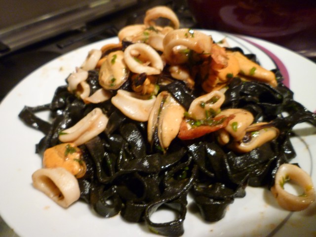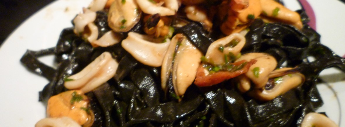 Para la pasta mezclar todos los ingredientes en una masa uniforme y elástica y dejar en la nevera durante 1 hora. Pasar la pasta en la máquina hasta obtener una hoja sutil (numero 5) y después cortar tagliatelles. Calentar en un sartén un poco de aceite de oliva y añadir el ajo, después añadir los mariscos. Cubrir el sárten y esperar algunos minutos hasta que los mejillones y almejas se abren. Ahora añadir un poco de vino blanco, el perejil picado, los tomates troceados, sal y pimienta. Cocinar la pasta durante 2 minutos y mezclar con el condimento.
