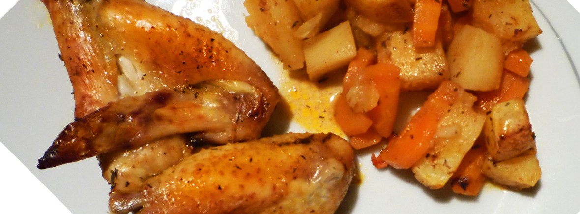Pelamos y cortamos las zanahorias a rodajas de 3 mm y las papas en trocitos de 1cm/2cm. En un molde de aluminio mezclamos a mano todos los ingredientes y al final vertemos la cerveza en cima. Horneamos el pollo con cerveza a 250C° durante 30 minutos para las alitas o en el caso del os muslos 45 minutos. Mi consejo es de girar los trozos de pollo durante su cocción para conseguir una piel crujiente uniforme y dorada. Servimos nuestro pollo con las papas, las zanahorias y la salsa de cerveza y tomillo.
