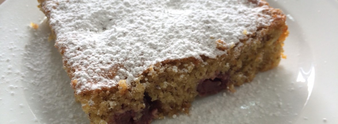 Precalentar el horno a 150°C. Separar las claras de las yemas y montar a punto de nieve con una pizca de sal. Montar la mantequilla con el azúcar, la vainilla hasta obtener una crema blanca y espumosa, añadir una yema a la vez, la leche y terminar con la harina y la levadura tamizada. Finalmente incorporar las claras montadas y mezclar delicadamente. Verter la masa en una bandeja forrada con papel de horno o un molde rectangular, y poner las cerezas encima. Cocinar en horno ventilado durante 30 minutos. Comprobar la cocción con un palillo. Dejar enfriar la tarta de cerezas y nueces encima de una rejilla. Se puede decorar con azúcar glas y para los mas golosos con mermelada caliente de cerezas.