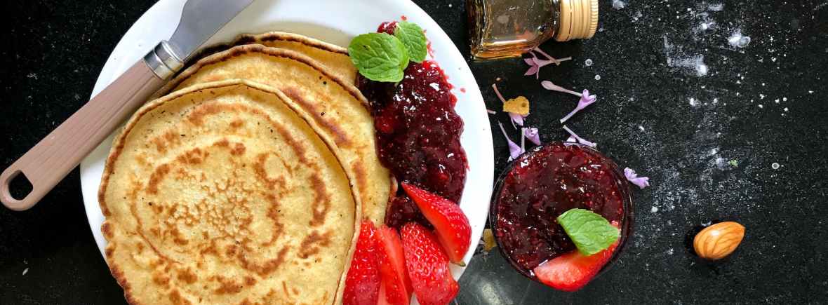 mermeladas y fruta fresca (fresas, frambuesas o arándanos) para acompañar las tortitas