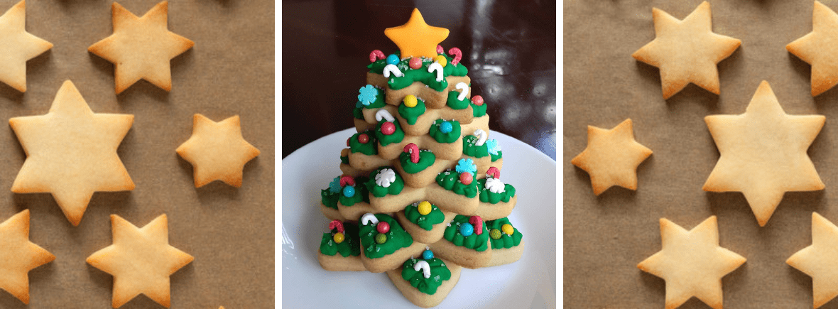 Para montar el árbol de Navidad, poner la galleta más grande como base en un plato, poner un poco de royal icing en medio de la galleta y poner una galleta más pequeña encima, así avanzando hasta llegar a la galleta más pequeña. Decorar el árbol con royal icing y sprinkles de varios colores. Para la estrella, extender un poco de fondant amarillo y recortar una estrella pequeña y colocar en la cima del árbol. Si no te gusta el royal icing, puedes decorar el árbol con azúcar glas. Las galletas están ricas con una taza de café. El Árbol de Navidad es un regalo ideal para estas Navidades.