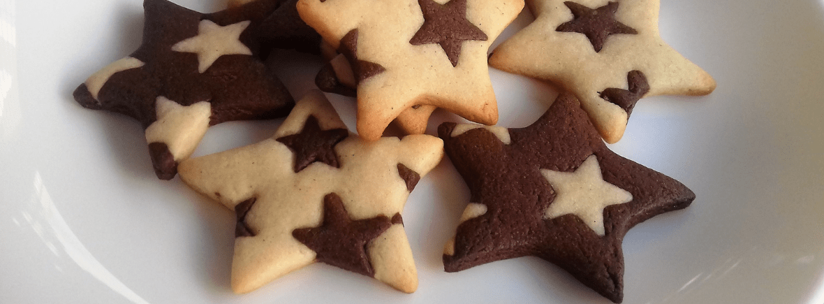 Sacar las masas de la nevera y amasar. Extender las masas entre dos hojas de papel de horno hasta 5mm de grosor y recortar estrellas pequeñas. Poner las estrellas oscuras en la masa blanca y viceversa. Pasar otra vez con el rodillo en todas las direcciones hasta que obtener un grosor de 3-4mm. Recortar estrellas mas grandes y posicionar encima de una bandeja forrada con papel de horno. Cocinar las galletas en el horno precalentado durante 8 minutos o hasta que se doren. Sacar del horno y dejar enfriar encima de una rejilla.