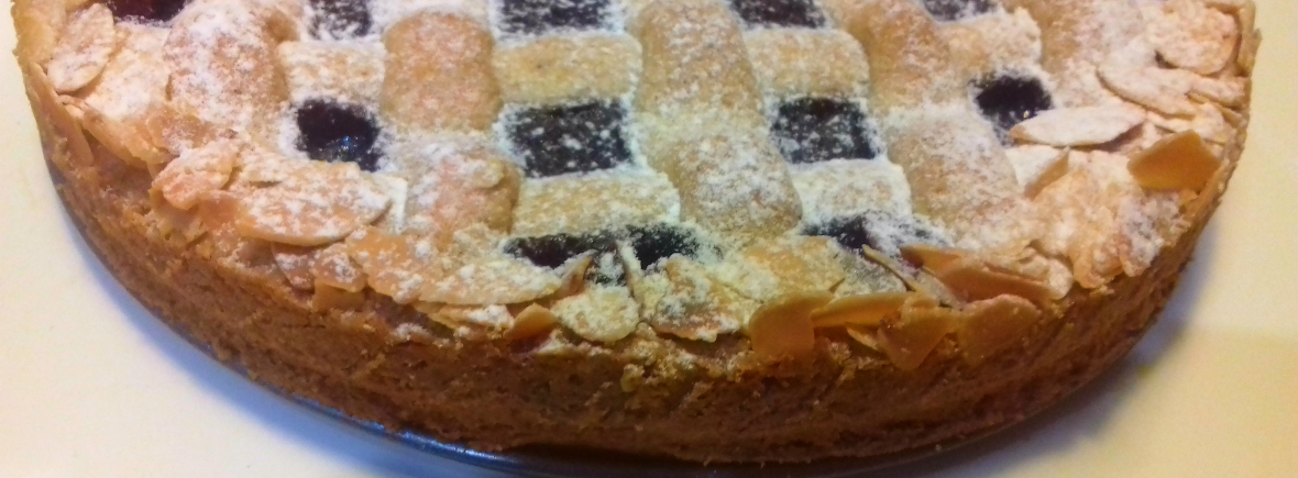 Forrar una molde de tartas de 24cm con 2/3 de la masa, apretar bien para formar un borde de 3cm de altura. Si la masa queda muy húmeda, mejor verter la masa en una manga pastelera y forrar el molde. En la base poner una oblea o dos cucharas de pan rallado que sirve como aislante. Distribuir la mermelada de grosellas y luego cubrir la tarta con tiras o churros de masa (con manga pastelera), apretar bien en los bordes y decorar con almendras en laminas.