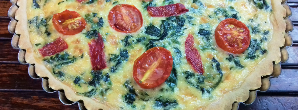 Precalentar el horno a 180°C. Para la masa, verter los ingredientes en un procesador de alimentos y picar hasta obtener unas migas finas. Extender la masa entre dos hojas de papel de horno hasta obtener un grosor de 5mm. Untar y enharinar un molde (diámetro 22/24cm) para quiche y poner la masa encima. Apretar bien con las manos y recortar el sobrante. Pinchar la superficie con un tenedor para que no se hinche la masa durante la cocción. Cocinar la base durante 20/25 minutos en el horno ventilado, sacar y reservar. Para el relleno, poner en un bol la nata de arroz, los huevos, el queso feta y batir hasta obtener una crema lisa. Salpimentar y reservar. Picar el diente de ajo y sofreír en una sartén con un poco de aceite, añadir las espinacas frescas y cocinar a fuego vivo durante 3 minutos o hasta que se evapore el liquido. Distribuir las espinacas encima de la quiche, verter la mezcla de nata y queso, y terminar con algunas tiras de pimienta asada y tomates cherry cortados por la mitad. Cocinar la quiche durante 30 minutos en el horno ventilado. Servir templado.