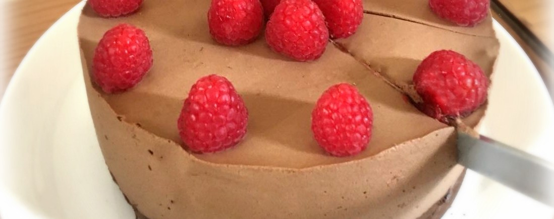 Para el montaje de la tarta, colocar un aro ajustable, forrado con papel de horno, en un plato. Colocar el bizcocho de chocolate y ajustar bien el aro. Verter la mitad de la mousse y nivelar bien. Colocar la gelatina de frambuesas y cubrir con el resto de la mousse y nivelar bien la superficie. Poner la tarta durante 2 horas en el congelador y luego dejar reposar en la nevera. Sacar la tarta 20 minutos antes de servirla, desmoldear con cuidado y decorar con algunas frambuesas frescas. Una tarta espectacular, con un sabor intenso, ligera, golosa y poco dulce.