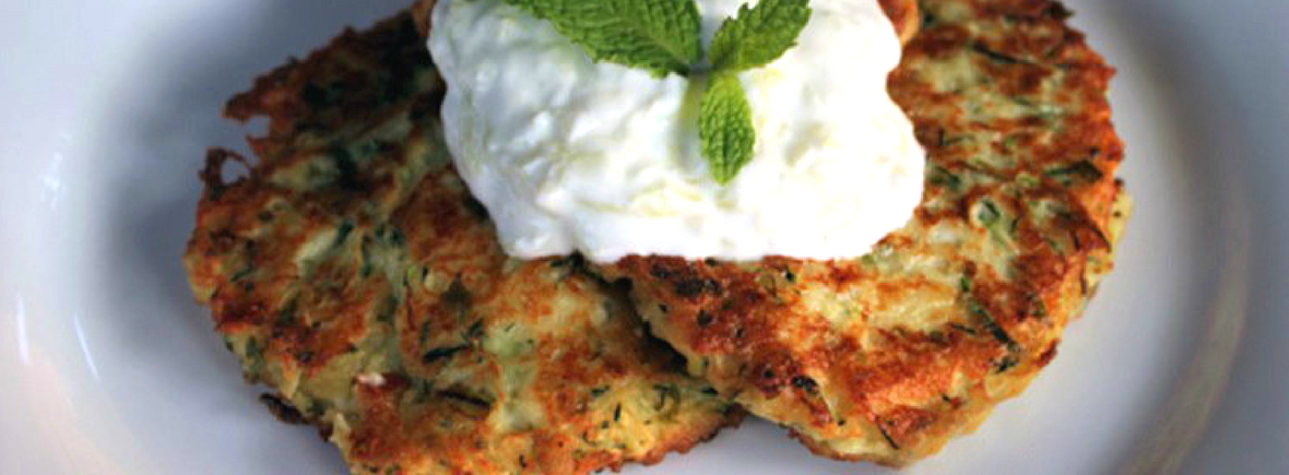 Rallar el calabacín, colocar en un paño de cocina, añadir sal y exprimir todo el liquido. Importante obtener una bola de calabacín compacta y seca. Cortar una media cebolla finamente. En un bol verter el calabacín, añadir la cebolla, el queso feta desmenuzado, el huevo, las especias y mezclar bien. Salpimentar la masa y finalmente añadir la harina y mezclar rápidamente. Calentar un poco de aceite de oliva en una sartén y añadir una cuchara de masa por cada tortita, aplastar ligeramente y cocinar durante 2 minutos por cada lado o hasta que se doren. Servir con yogur griego o con salsa tzatziki.